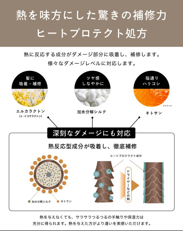 ※本品は、熱反応型のため、ドライヤーやアイロンの熱により、枝毛の抑制やキューティクルの疎水性がさらにアップします。もちろん、熱を与えなくてもサラサラツルツルの手触りや保湿力は十分に得られます。